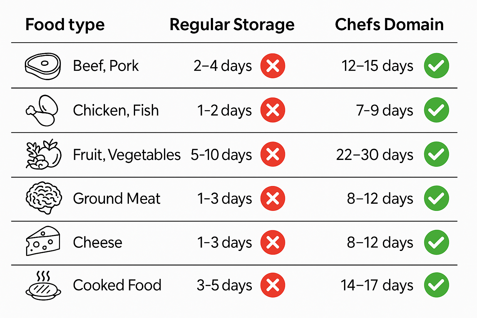Chefs Domain™ Vacuum Sealer helps extend your food’s shelf life by up to 5× — whether it’s kept in the fridge, freezer, or pantry.